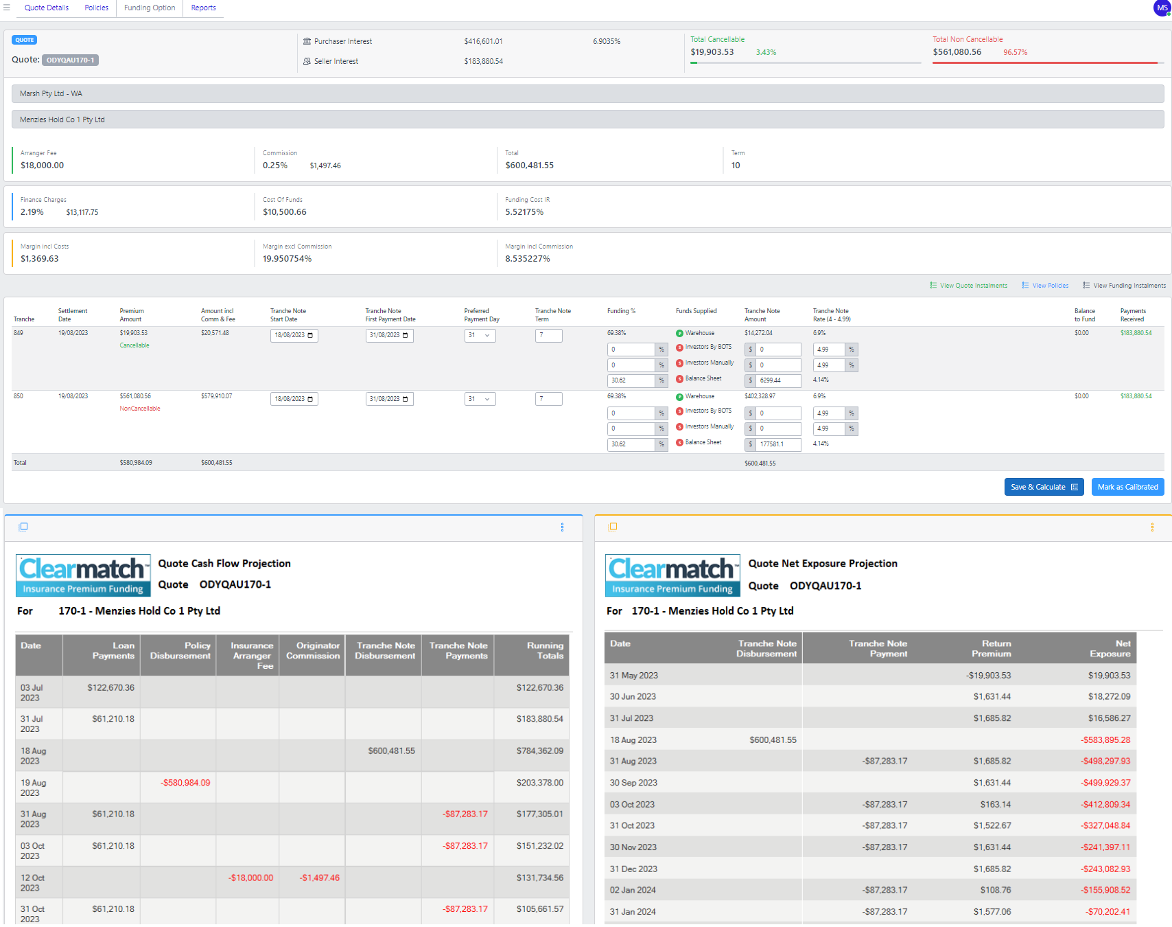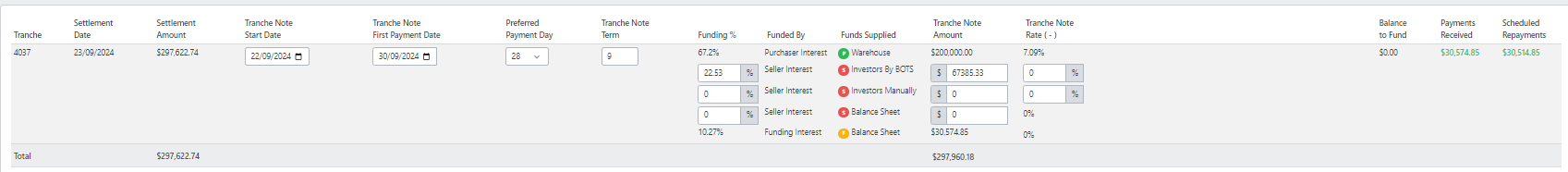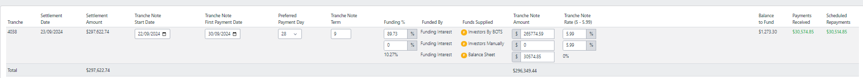 Funding percentage: The percentage of the "amount incl comm and fees" that will be funded. This will determine the "Tranche Note Amount" which is the amount that will be funded by tranche notes. You are also able to update the tranche note amount which will in turn adjust the funding percentage