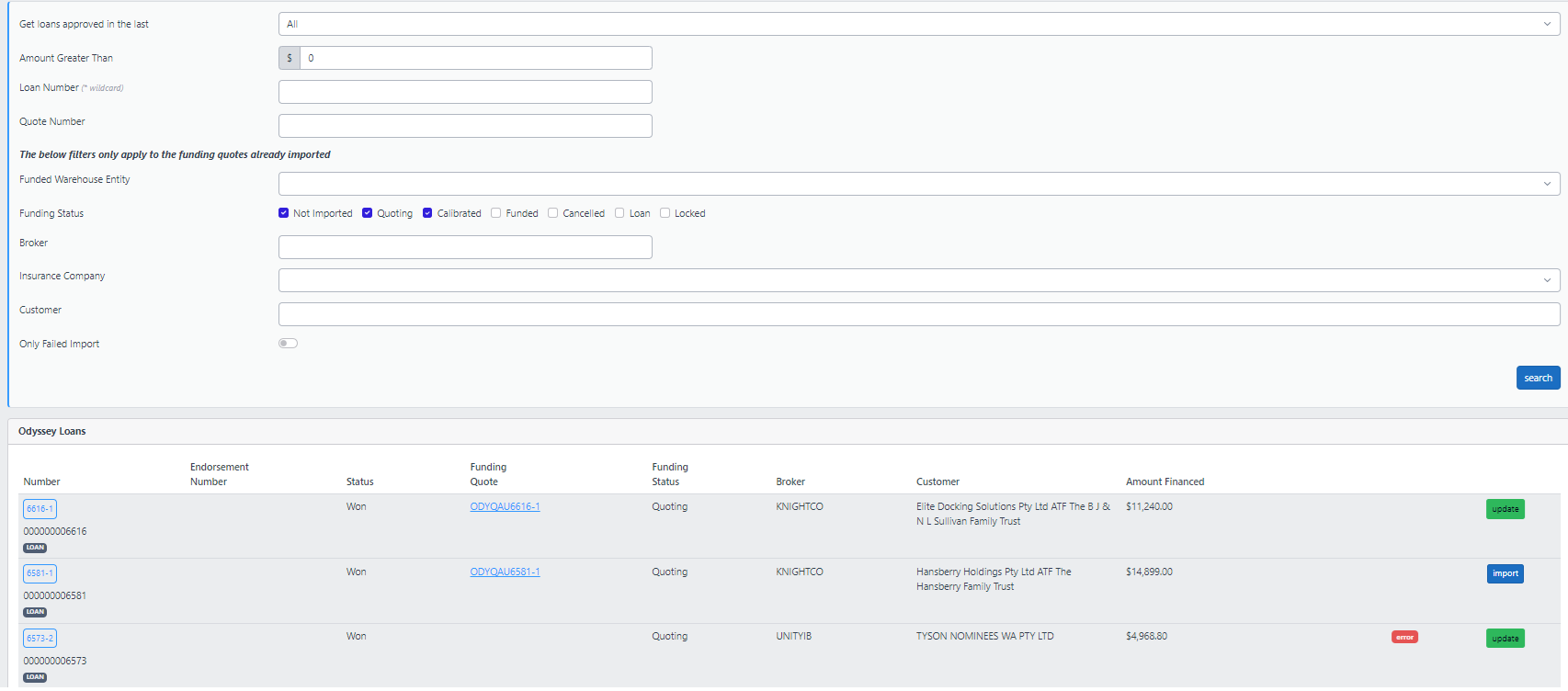 There reaming filter options use data from within Clearquote, not Odyssey to retrieve the loan, allowing you to filter for loans already previously imported.
