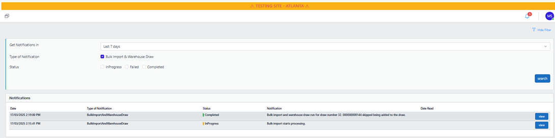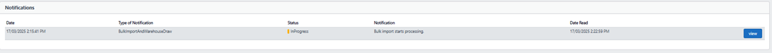 The type of notification is hyperlinked and will navigate the user to the specific page depending on what type of notification it is. Example if the notification type is “bulk import and warehouse load” then the user will be navigated into the bulk import and warehouse load page for the specific row selected.