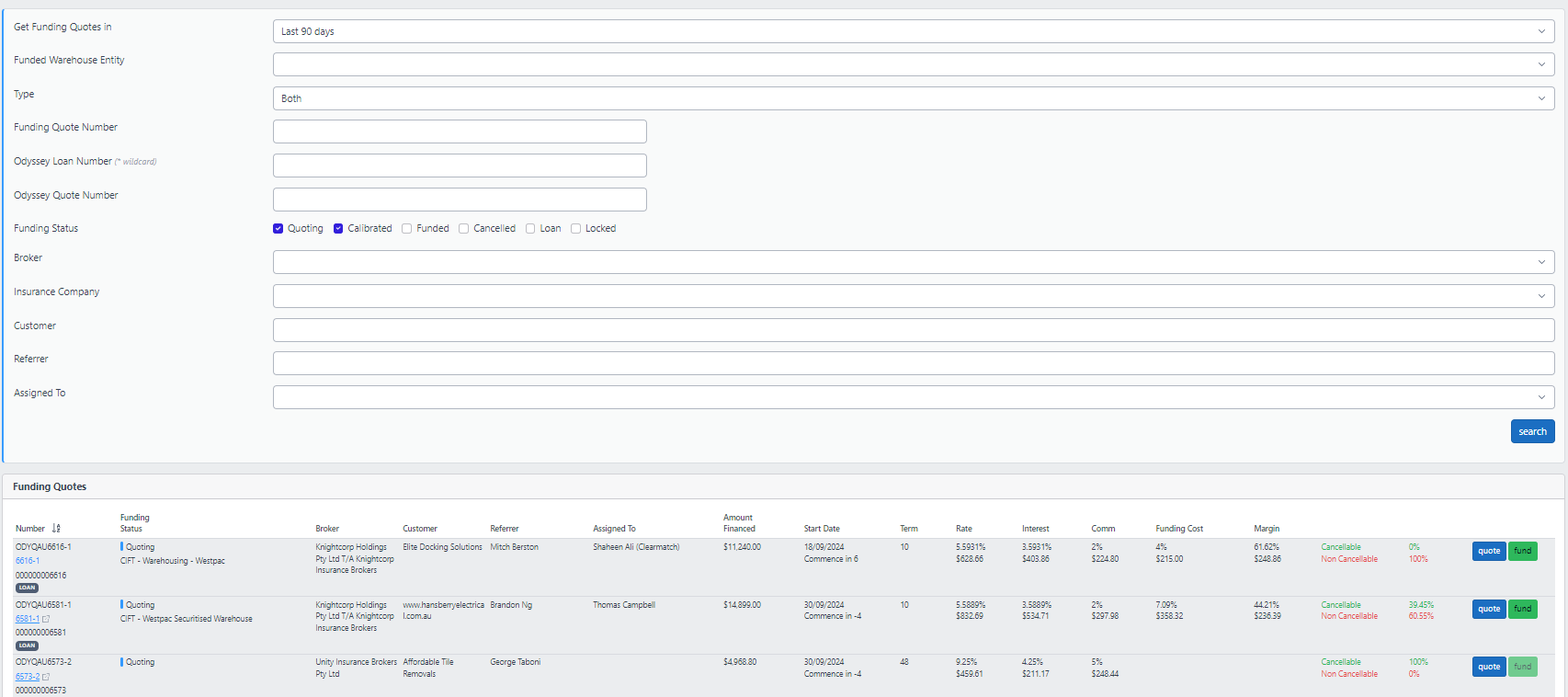 3. You will be presented with a page that will automatically list the quotes that have been created in the last 90 days that have a funding status of "Quoting" or "Calibrated". See