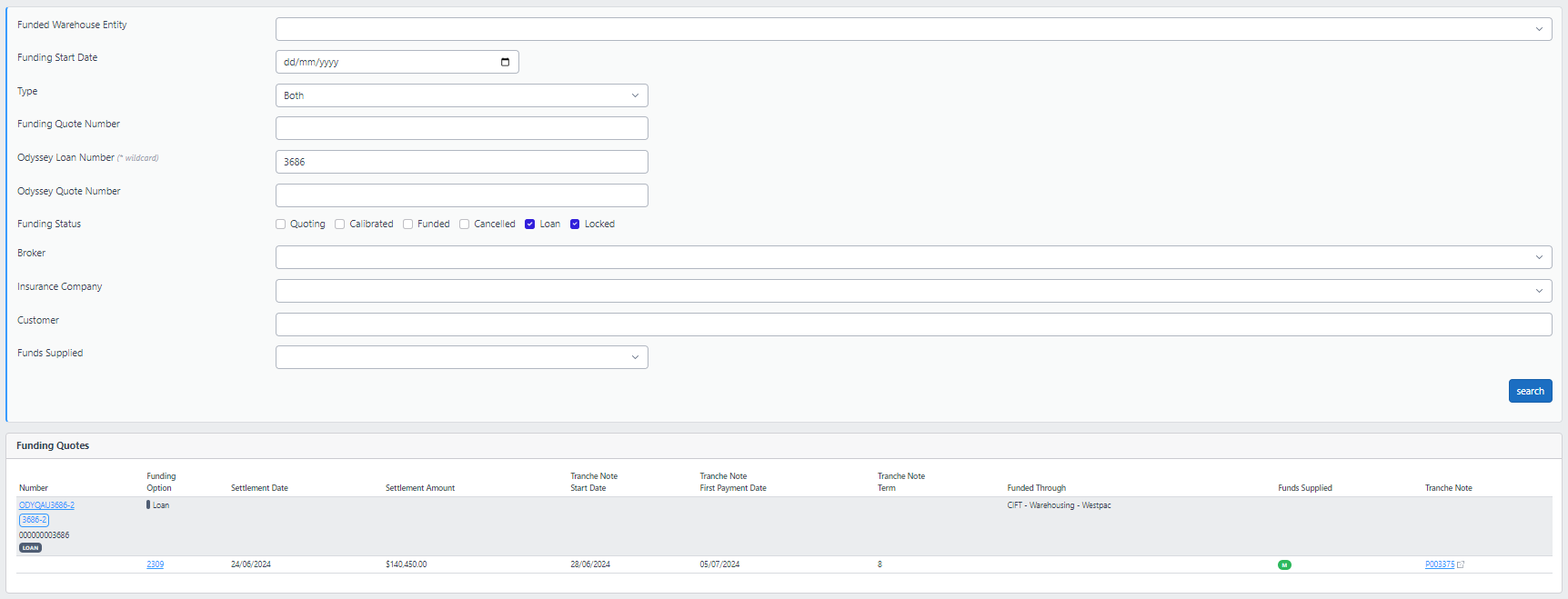 3. You will be presented with a page that will automatically list the quotes that have funding options that have been calibrated and not yet flagged as "funded", which indicates they are ready to fund.