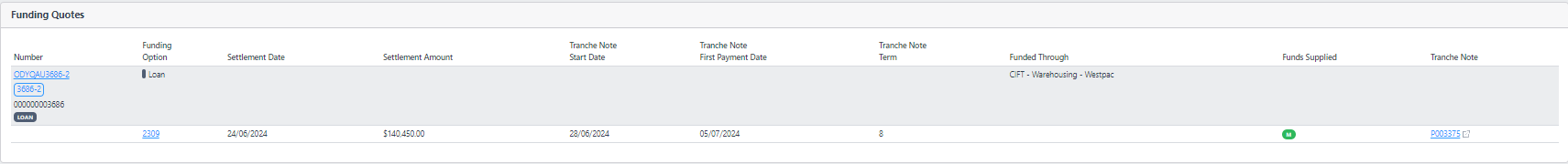 All tranches from the funding quotes, can be viewed in one place under the tranche menu. From here a use can easily flag a tranche on a loan that is not to be funded by a warehouse as being "ready to fund" whereafter it will be picked up for tranche note generation in order for funding to take place.