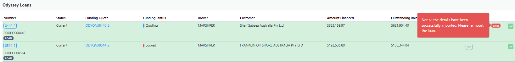 Any loans that fail the import will be flagged with an error icon. these loans will have to have the issues rectified and can then be added to the new warehouse draw created.