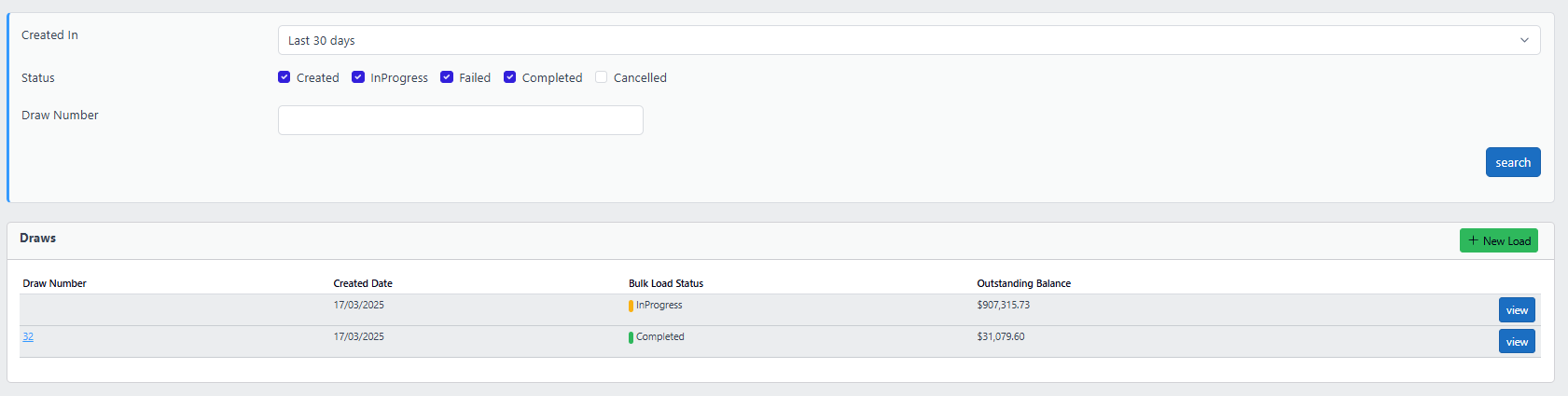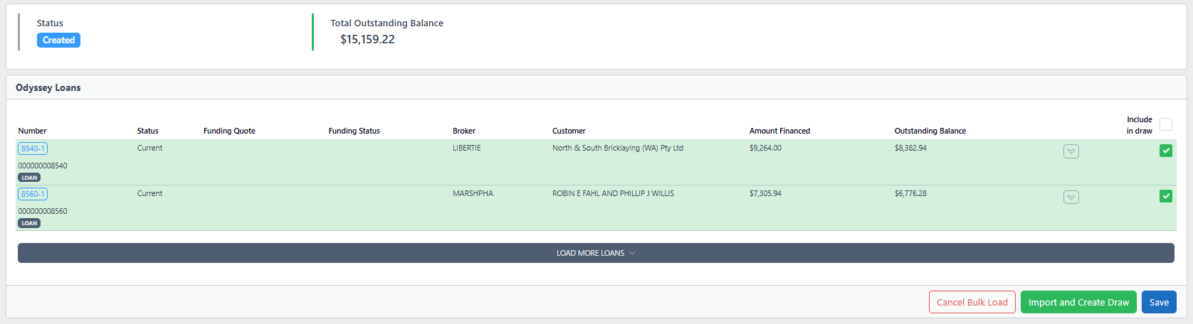 Import and Create Draw. Once saved, the next step is to process the bulk load. this will perform all the operation son the loan sin the list as described above in the overview at the top of this page.. To do this click